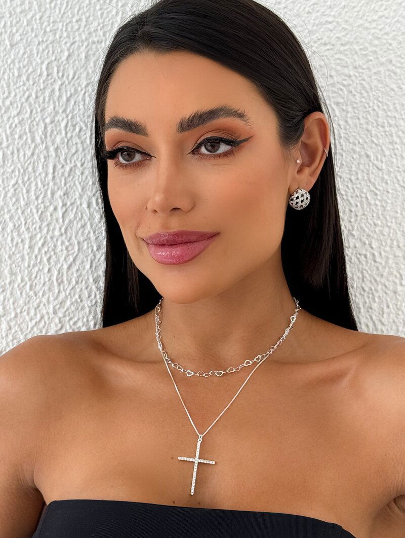 3. Colar Duplo Folheado a Prata 925 com Corações e Crucifixo