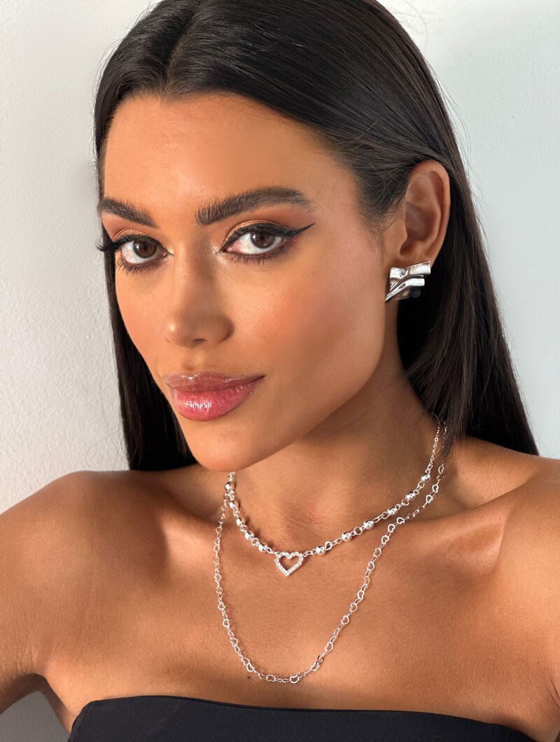 3. Colar Duplo Folheado a Prata 925 Elos Corações com Esferas Lisas