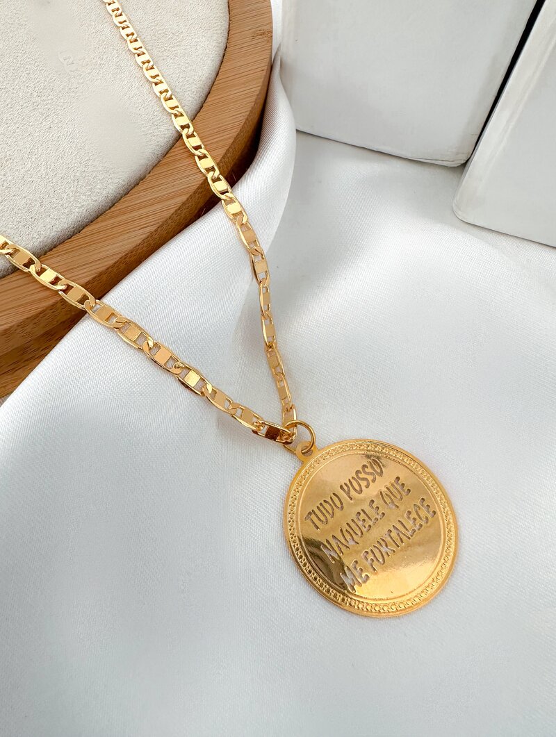 Colar Folheado a Ouro 18k Cordão Piastrine com Pingente "TUDO POSSO NAQUELE QUE ME FORTALECE"