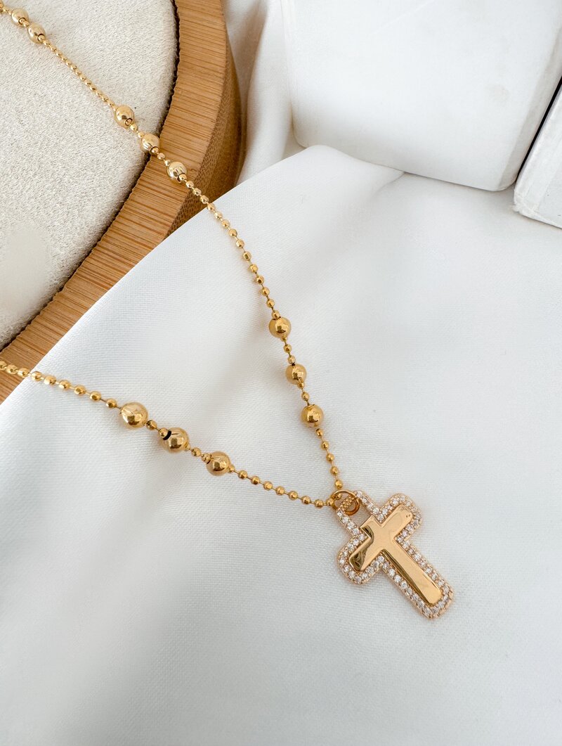 3. Colar Folheado a Ouro 18k Corrente com Esferas e Crucifixo Cravejado