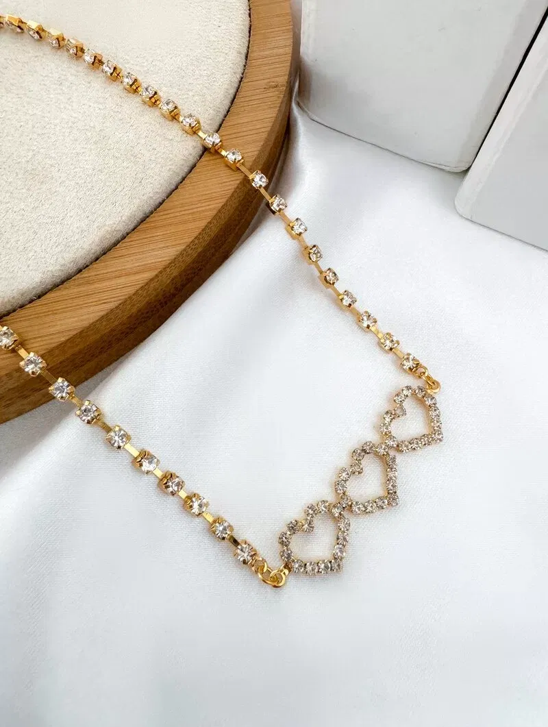3. Colar Folheado a Ouro 18k Corrente de Zircônias com Corações Cravejados
