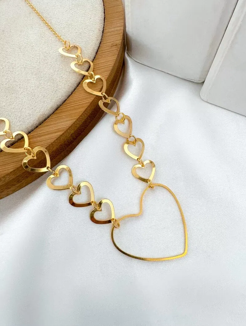 Colar Folheado a Ouro 18k Corrente e Pingente de Corações Vazadas