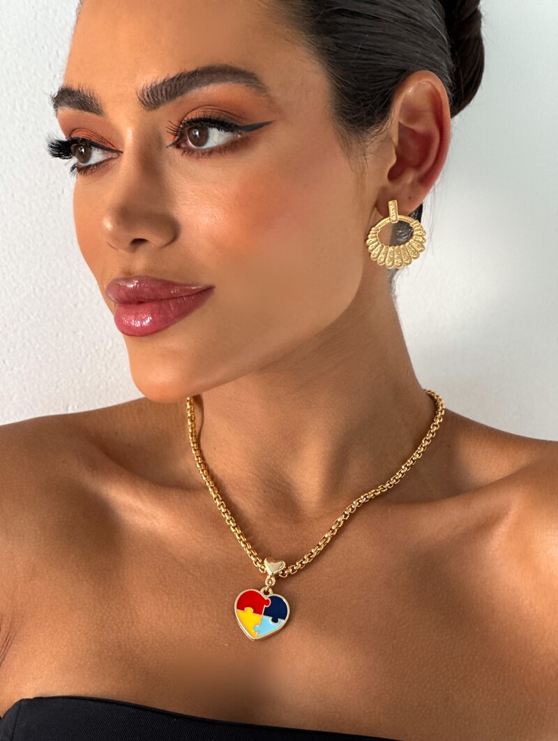Colar Folheado a Ouro 18k Corrente Elo Quadrado Coração Neurodiversidade