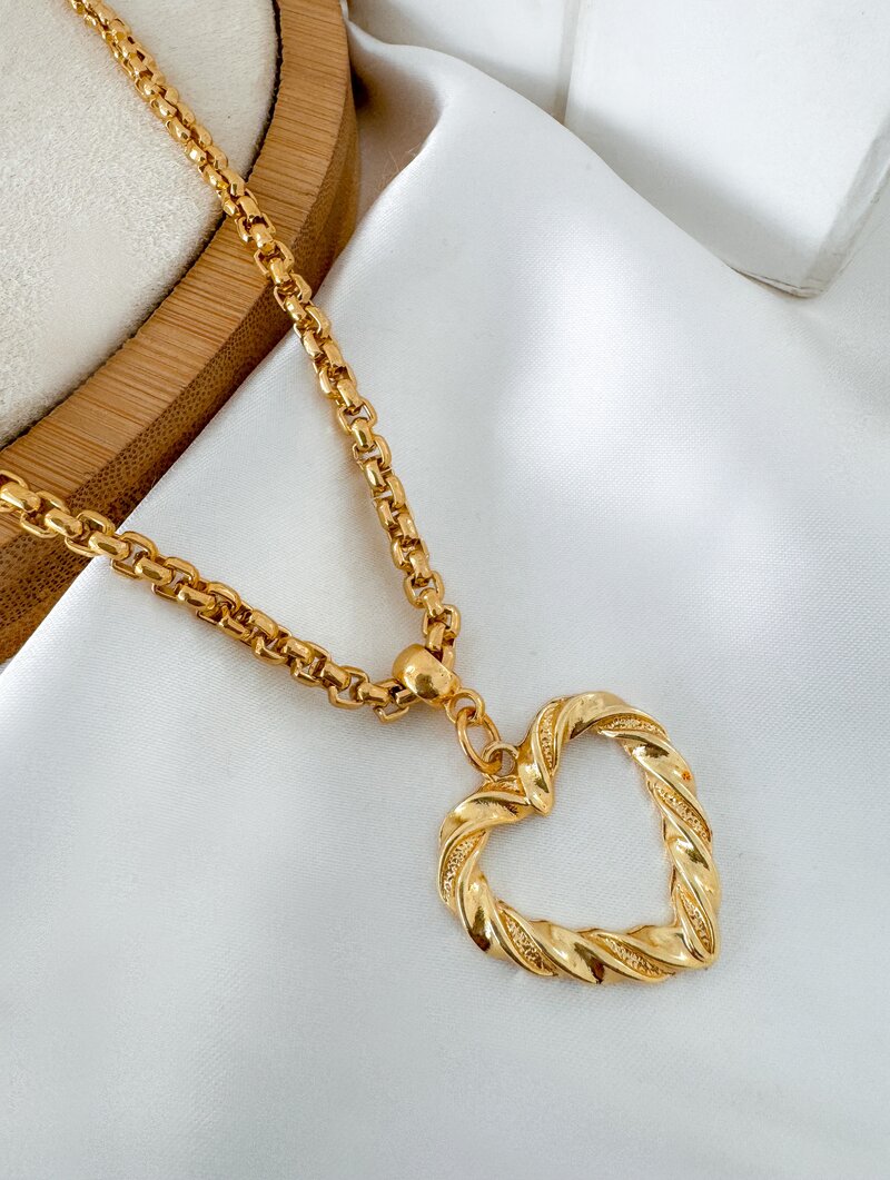 Colar Folheado a Ouro 18k Corrente Quadrada com Coração Torcido Vazado