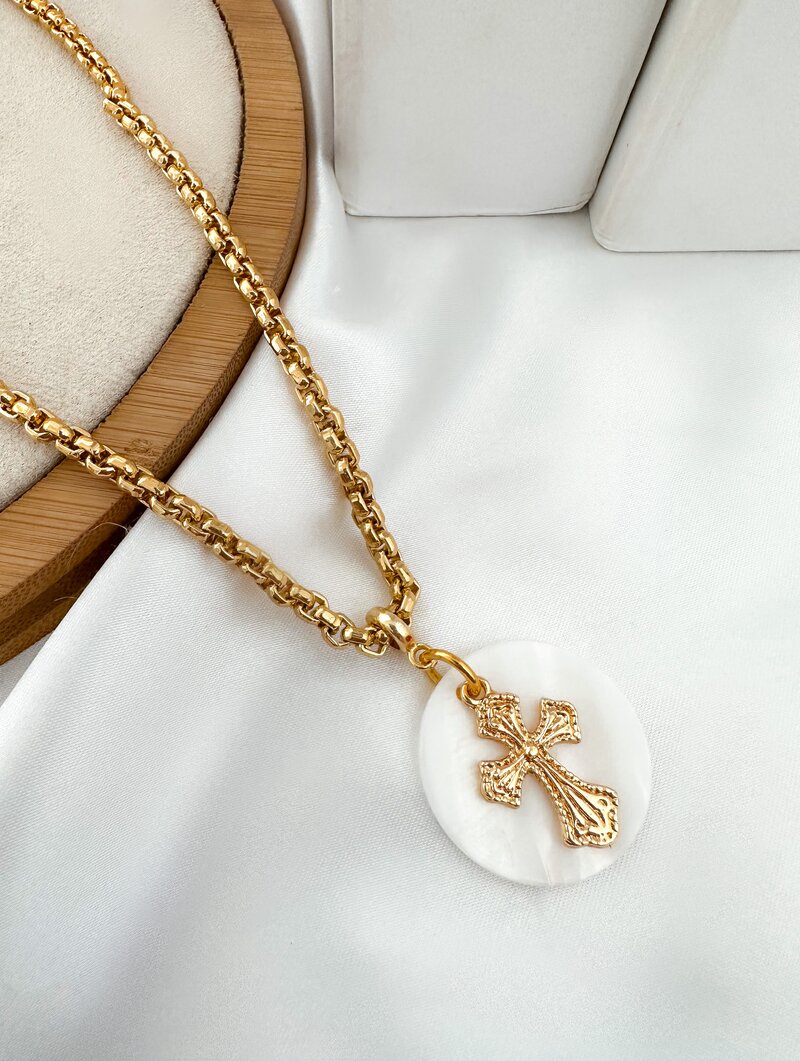 3. Colar Folheado a Ouro 18k Corrente Quadrada com Pingente Madrepérola com Crucifixo