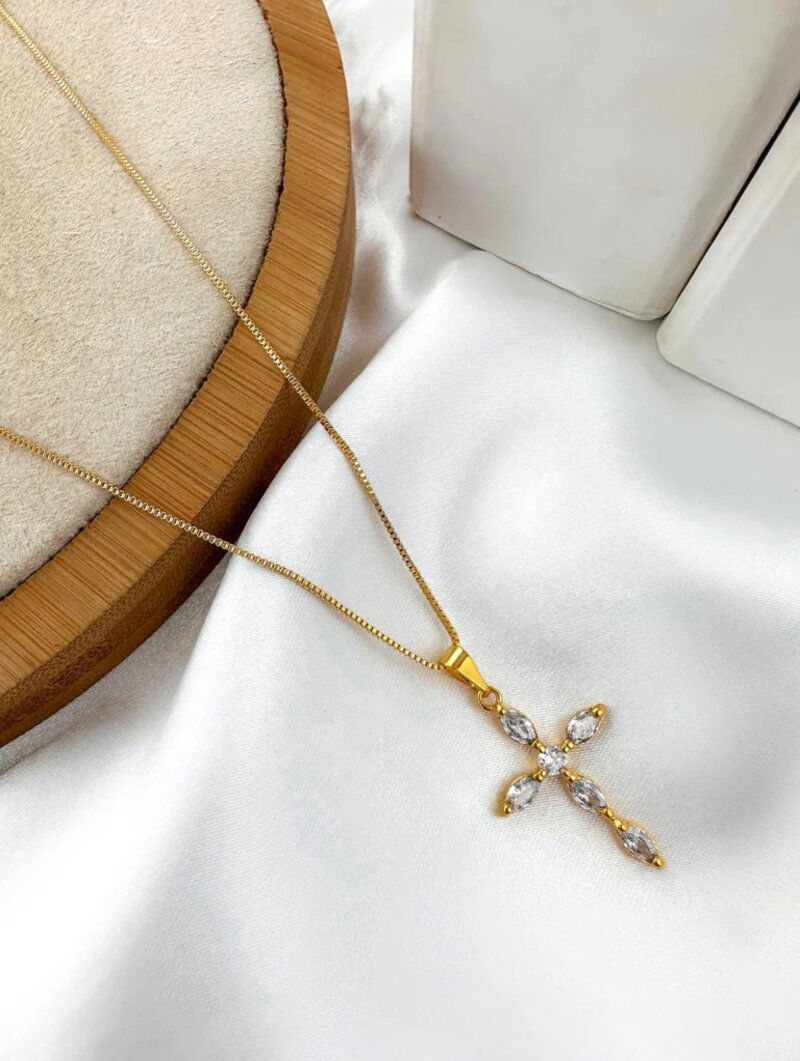COLAR FOLHEADO A OURO 18K CRUCIFIXO COM ZIRCÔNIAS CRISTAL.