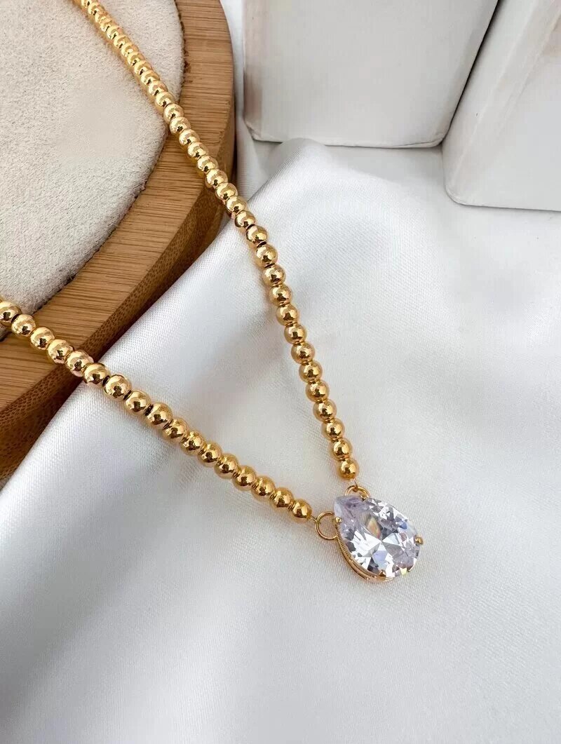 3. Colar Folheado a Ouro 18k e Prata 925 Esferas Lisas com Gota de Zircônia