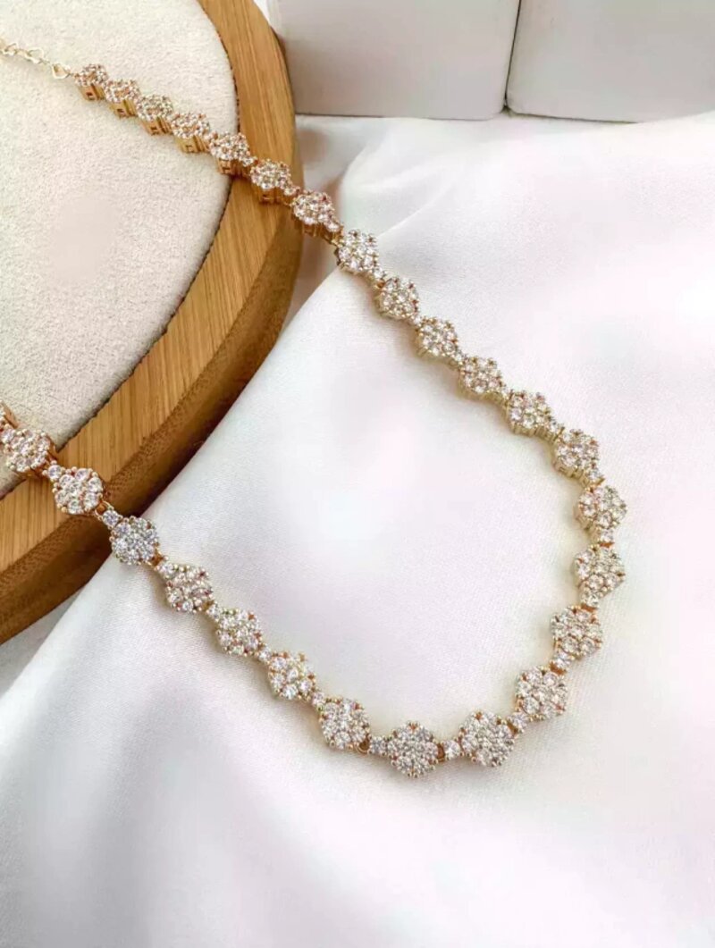 2. colar folheado a ouro 18k e prata 925 flores ligadas cravejadas com micro zircônias.