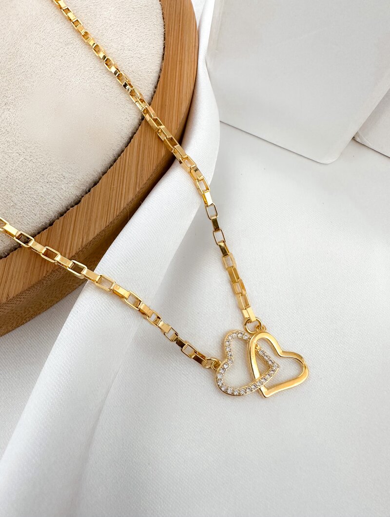 3. Colar Folheado a Ouro 18k e Prata Corrente Quadrada com Coração Duplo
