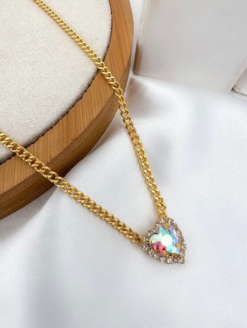 3. Colar Folheado a Ouro 18k Elos Pequenos com Pingente Coração de Zircônia com Borda Cravejada
