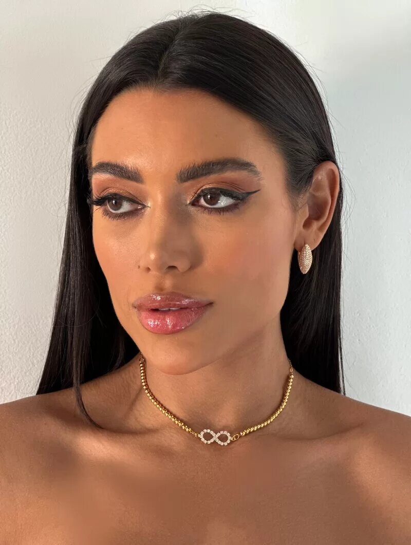 3. colar folheado a ouro 18k esferas lisas com símbolo do infinito .