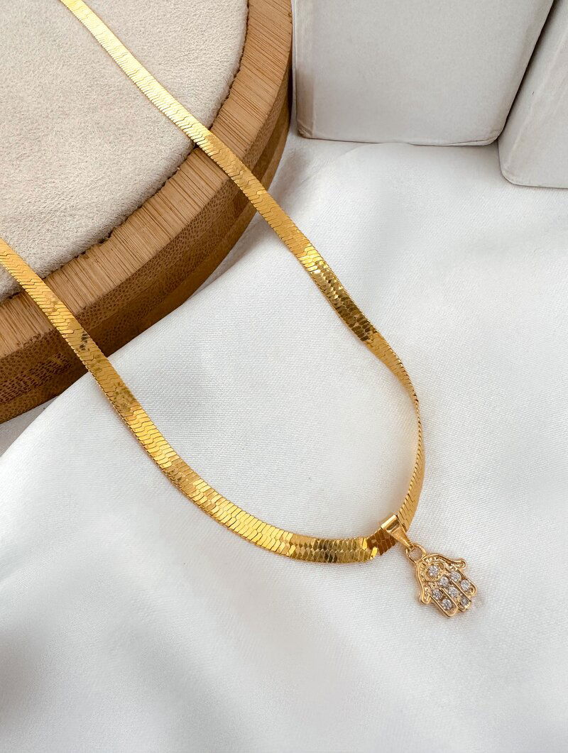 3. Colar Folheado a Ouro 18k Fita Laminada com Mão de Fátima
