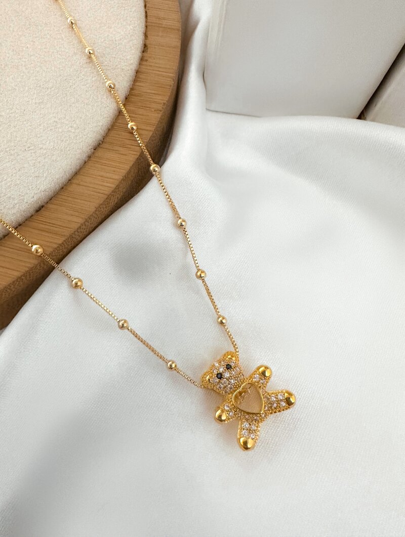 3. Colar Folheado a Ouro 18k Ursinho Cravejado com Coração Vazado