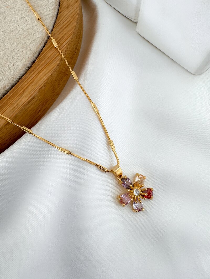 3. Colar Folheado a Ouro 18k Veneziana com Flor de Zircônias Coloridas
