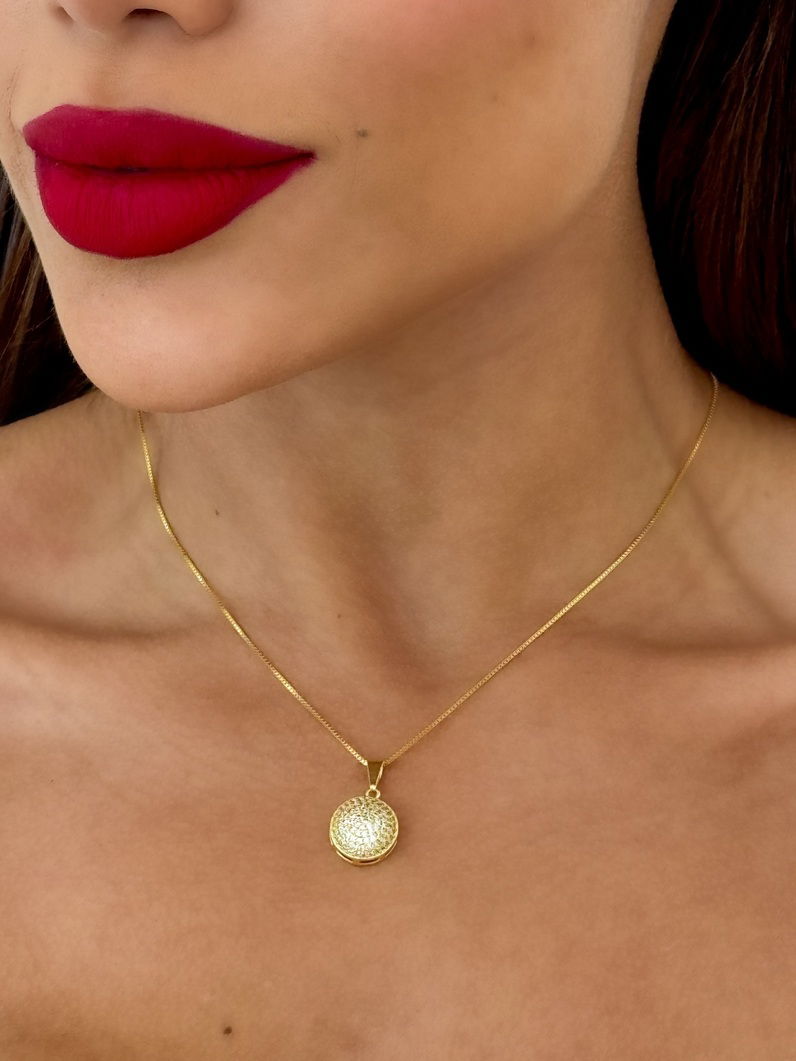 Colar Folheado a Ouro 18k Veneziana com Pingente de Esfera Cravejado