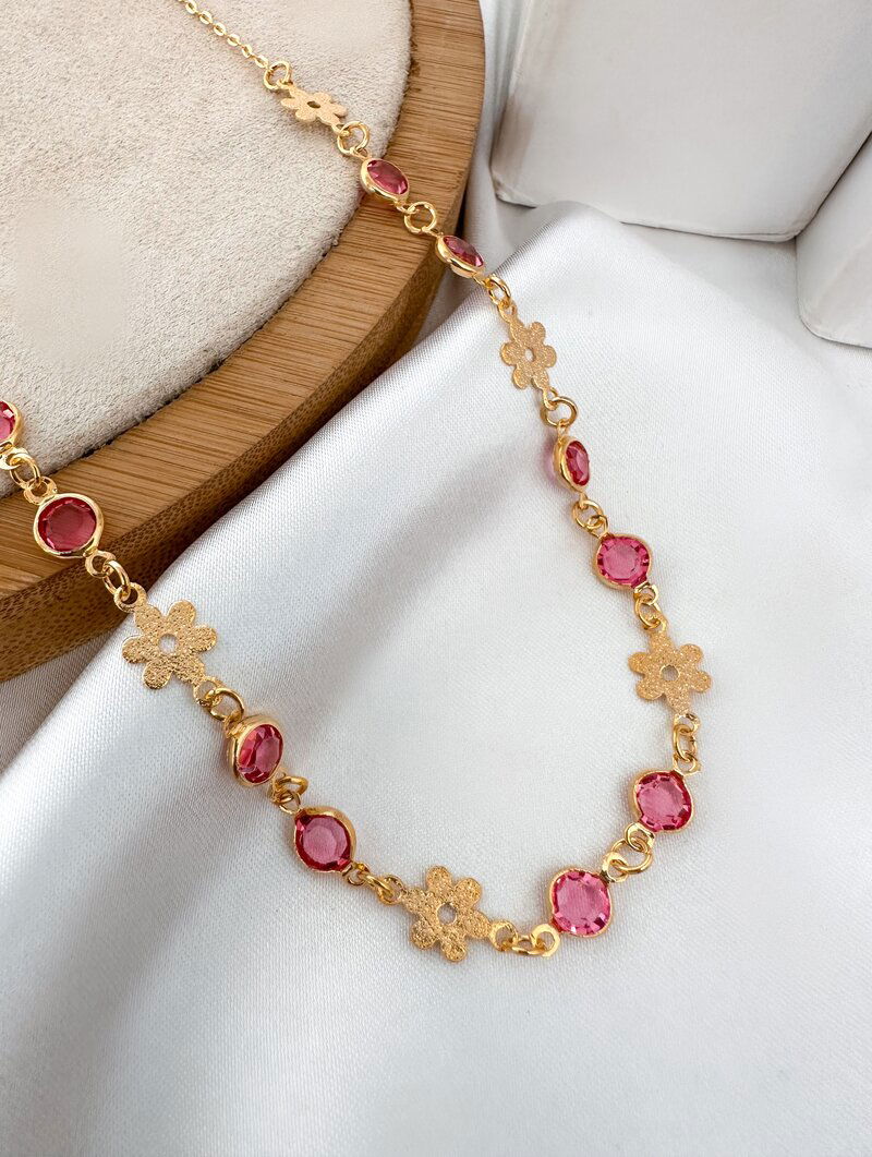 3. Colar Folheado a Ouro 18k Zircônias Rosa com Flores