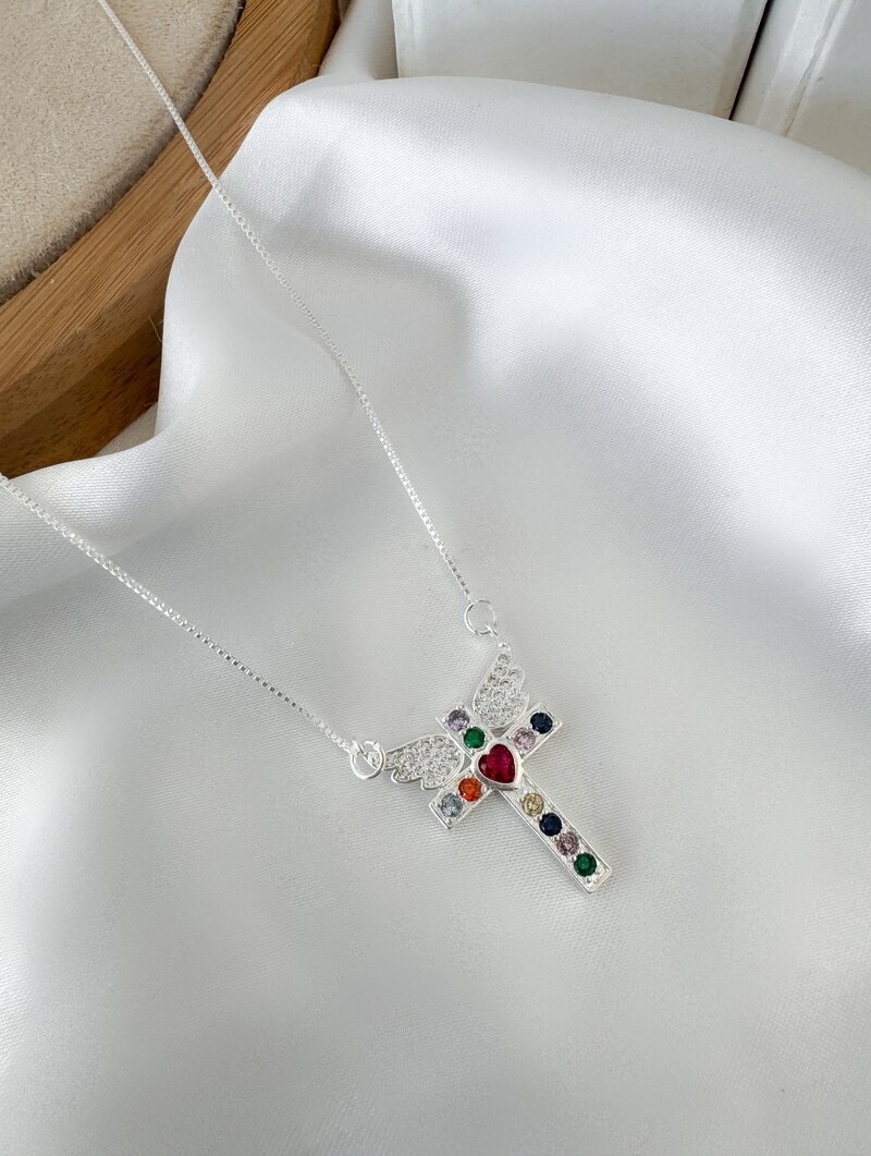 Colar Folheado a Prata 925 Veneziana com Crucifixo e Zircônias Coloridas