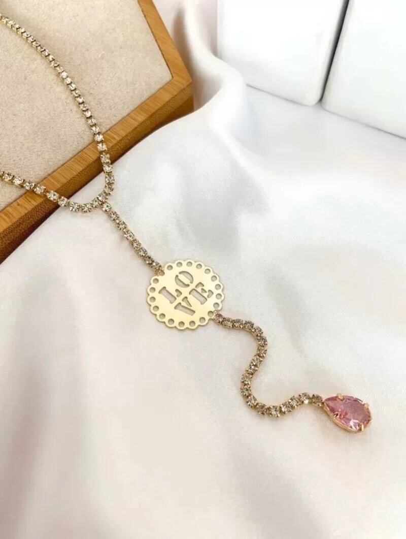 3. Colar lariat de zircônias com medalha love e gota cristal.