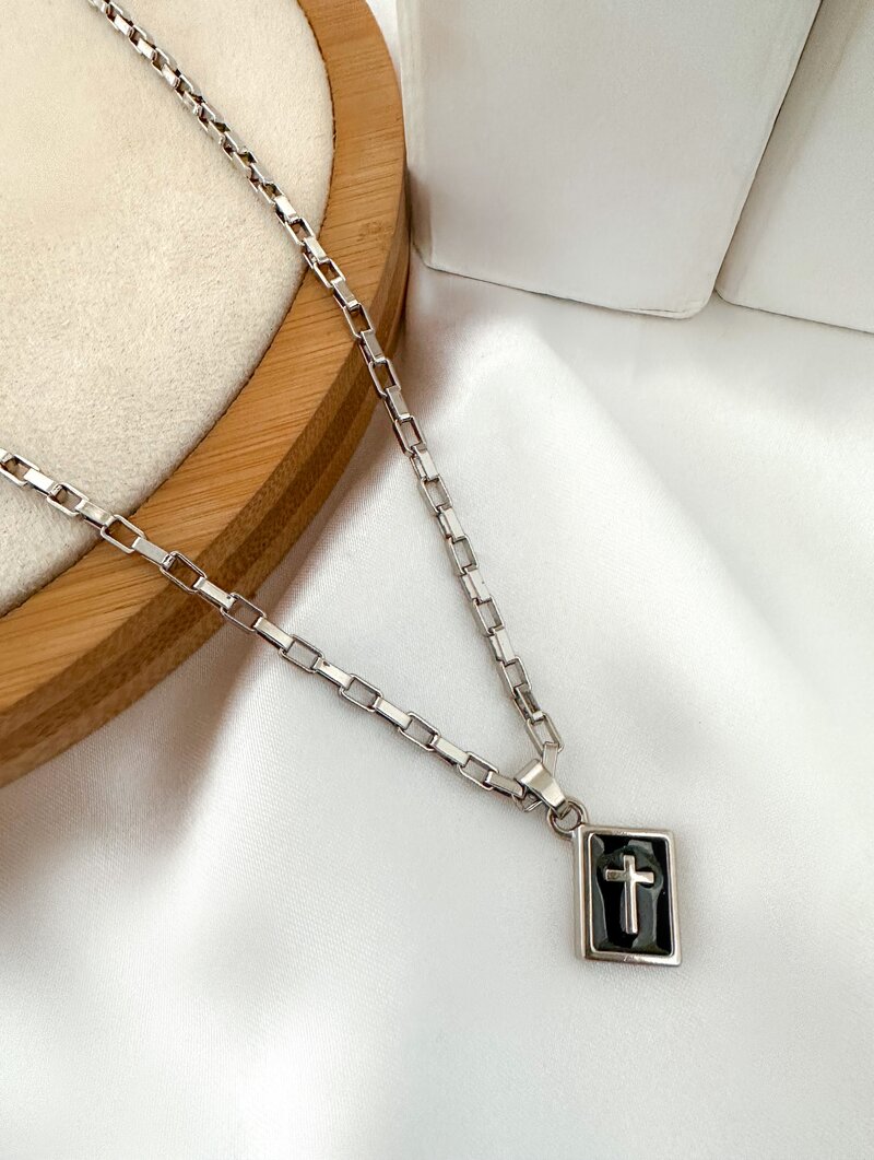 COLAR MASCULINO SEMI JOIA PLACA RESINADA PRETA COM CRUCIFIXO.