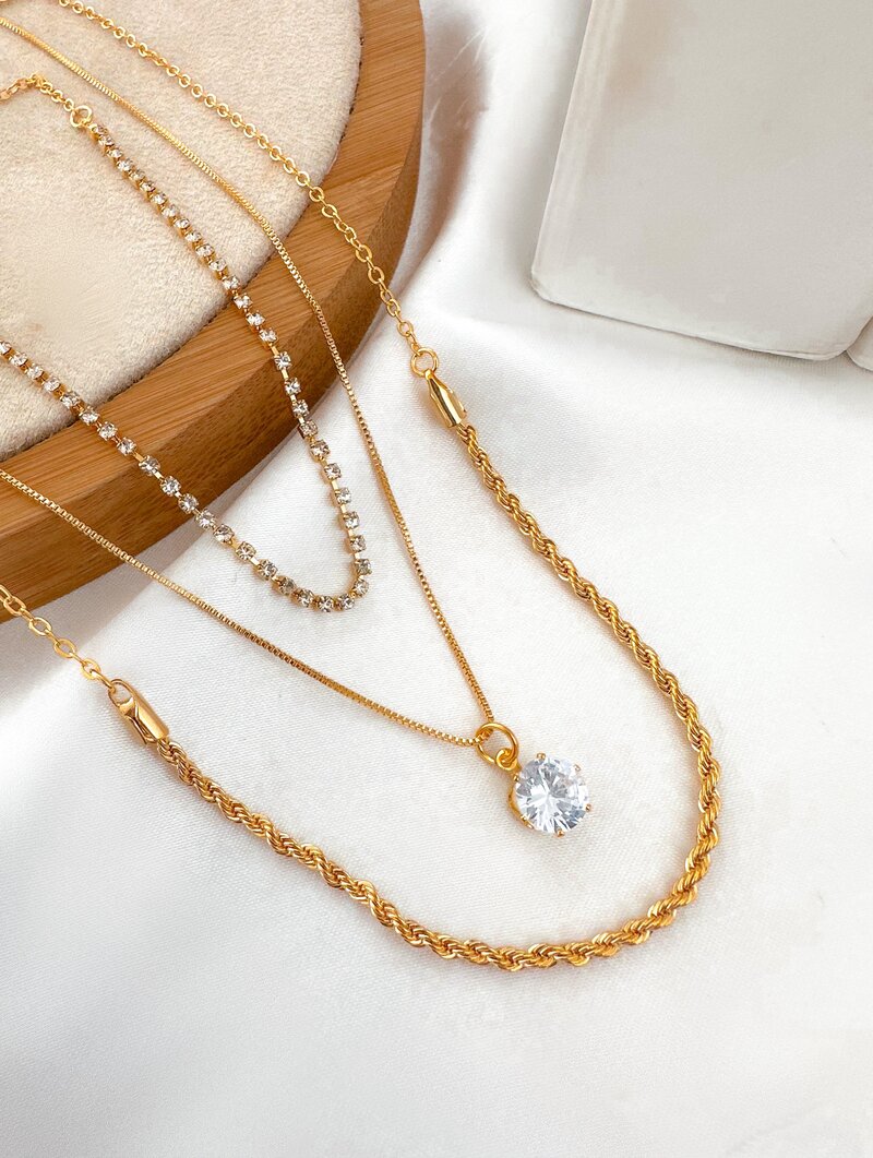 colar triplo folheado a ouro 18k cordão baiano, micro zircônias e pingente ponto de luz