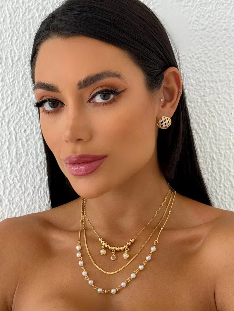 3. Colar Triplo Folheado a Ouro 18k Esferas Lisas e Pérolas