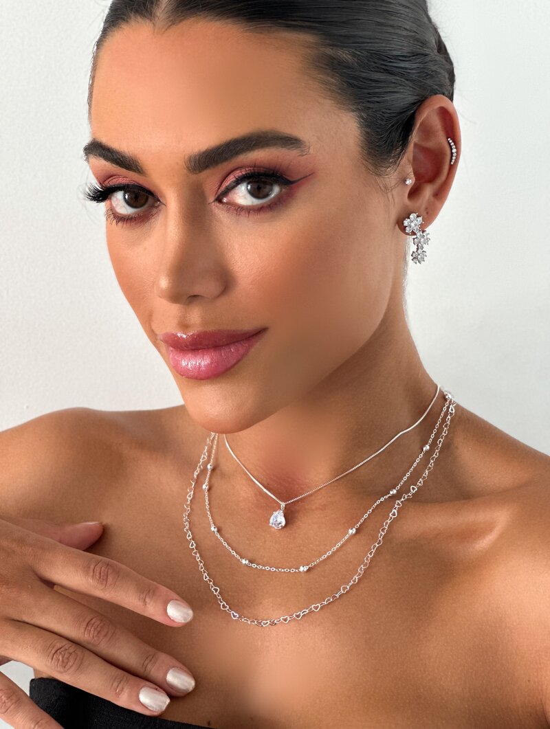 Colar Triplo Folheado a Prata 925 Corrente de Corações com Esferas e Gota Zircônia