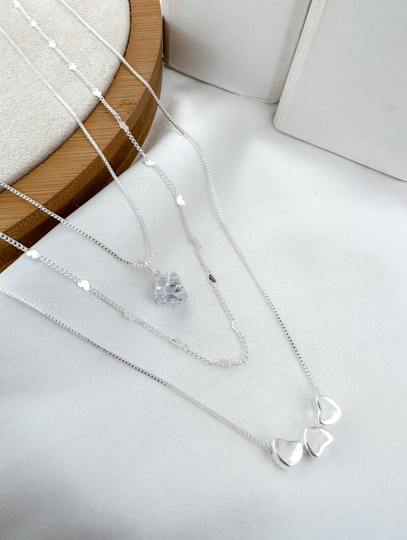 3. Colar Triplo Folheado a Prata Corações Lisos e Zircônia