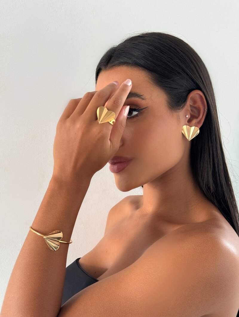 3. Conjunto Anel, Bracelete e Brinco Folheado a Ouro 18k Coração Martelado com Ponto de Luz