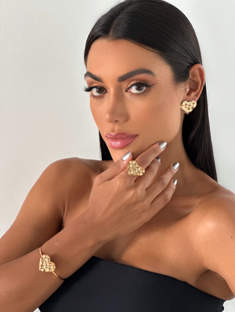 Conjunto Bracelete, Brinco e Anel Folheado a Ouro 18k Coração Martelado