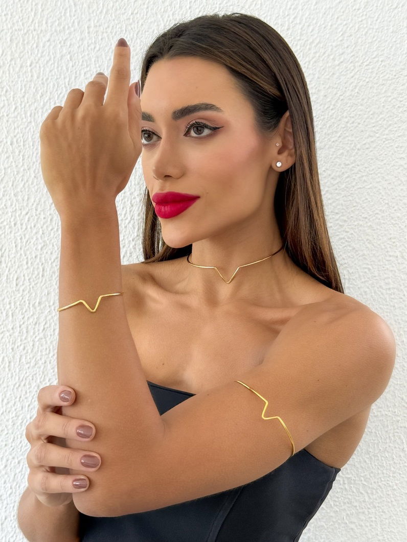 Conjunto Choker, Bracelete Pulso e Bracelete Bíceps Folheado a Ouro 18k e Prata Aro em "V"