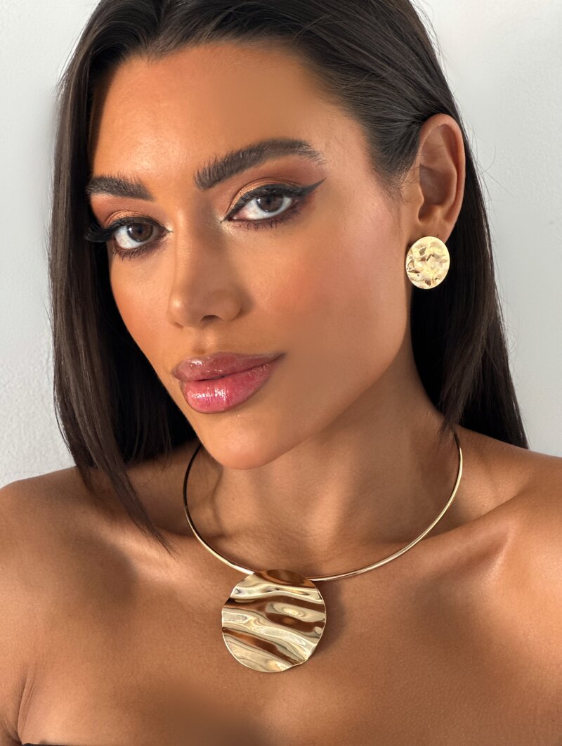 Conjunto Choker e Brinco Folheada a Ouro 18k e Prata Aro com Circulo Martelado