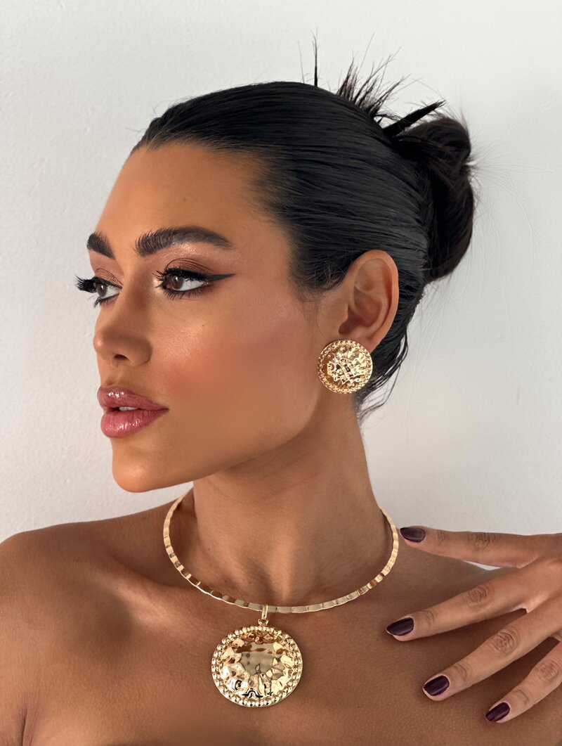Conjunto Choker e Brinco Folheada a Ouro 18k e Prata Aro com Circulo Martelado