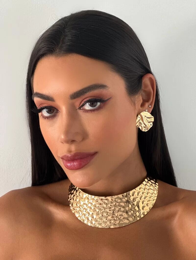 Conjunto Choker e Brinco Folheado a Ouro 18k e Maxi Aro Martelado
