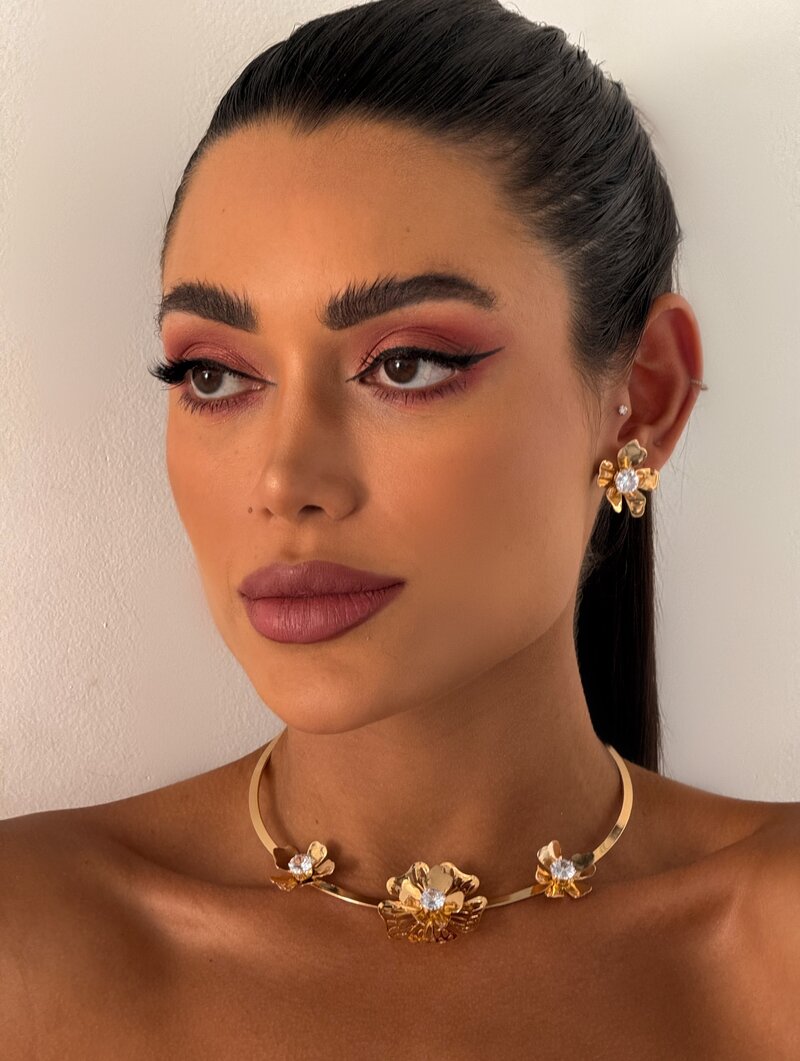 Conjunto Choker e Brinco Folheado a Ouro 18k e Prata com Flores Trabalhadas