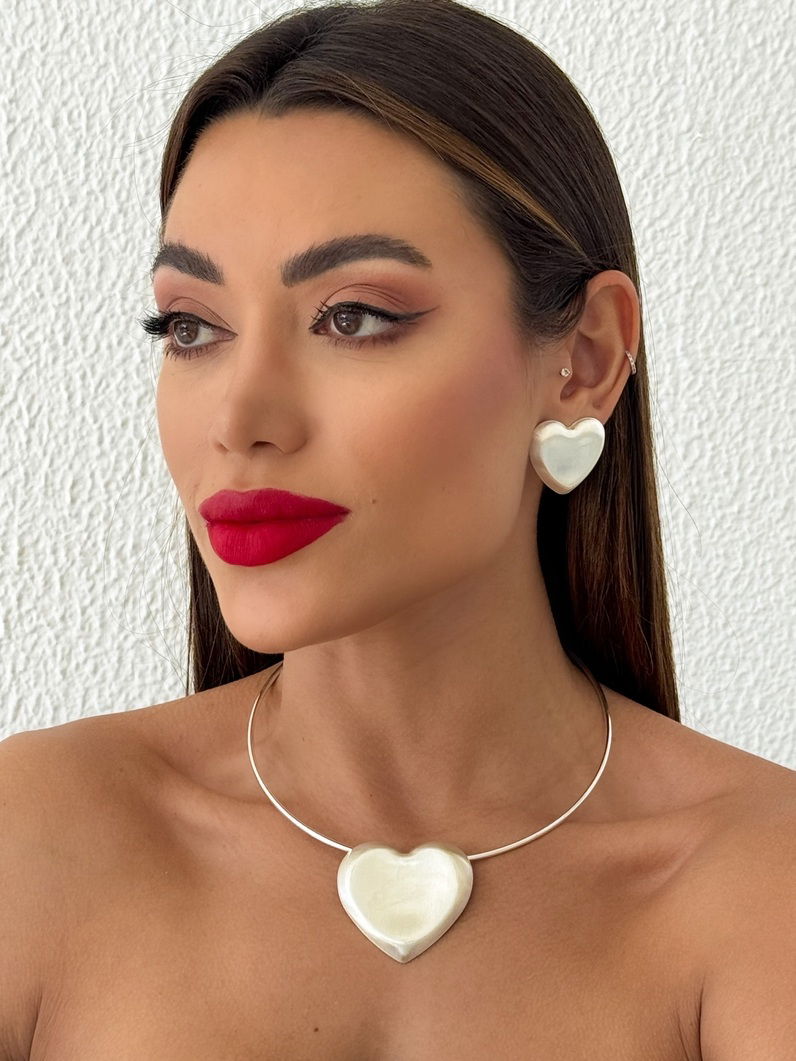 Conjunto Colar Aro e Brinco Folheado a Ouro 18k e Prata Coração Escovado