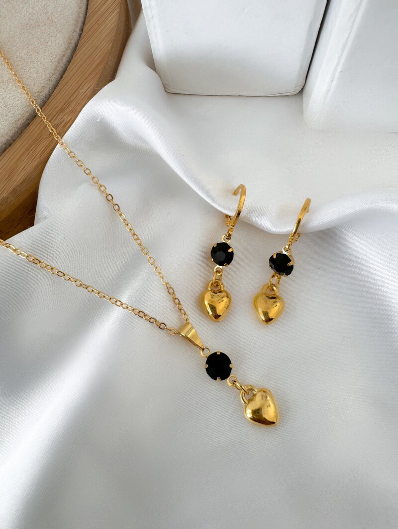 3. Conjunto Colar e Brinco Folheado a Ouro 18 Corações com Pedra