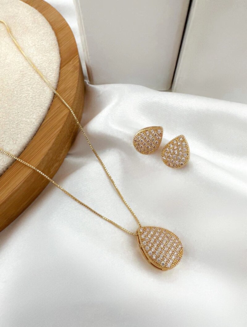 conjunto colar e brinco folheado a ouro 18k e prata 925 gota cravejada