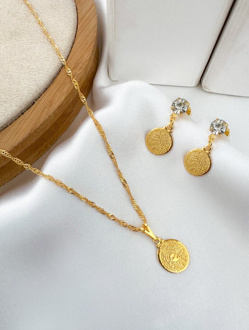 3. Conjunto Colar e Brinco Folheado a Ouro 18k e Prata 925 Medalha Pai Nosso e Ponto de Luz
