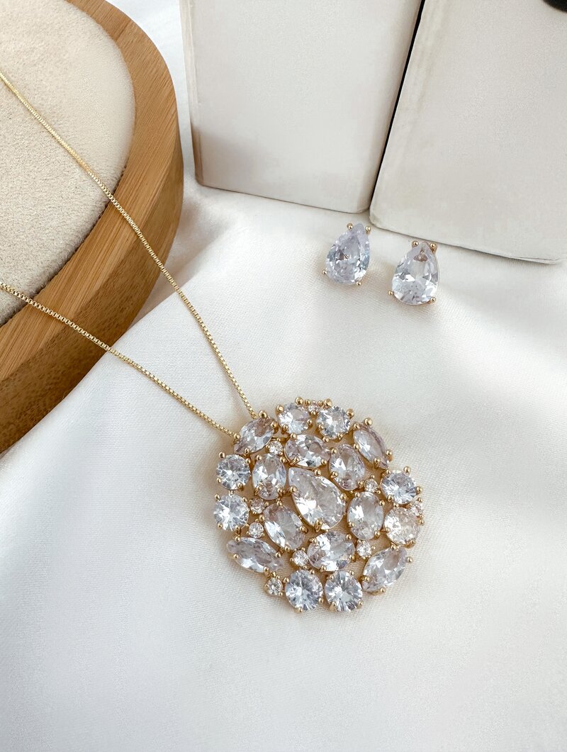 3. Conjunto Colar e Brinco Folheado a Ouro 18k e Prata Circulos de Pedraria em Zircônia