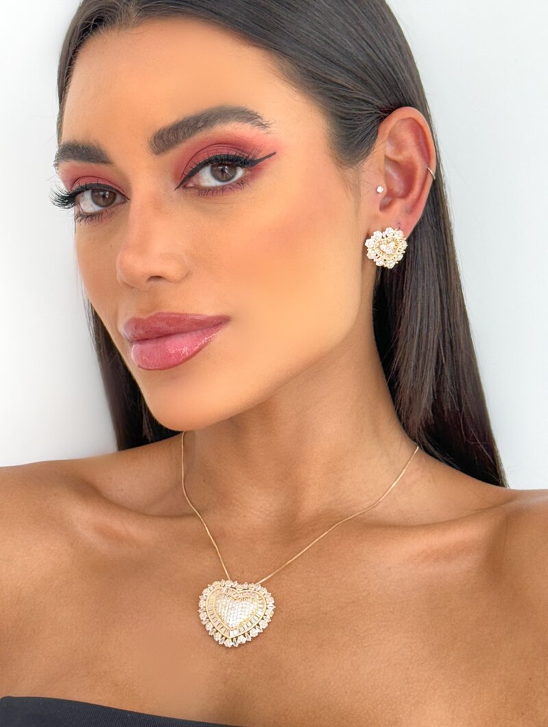 3. Conjunto Colar e Brinco Folheado a Ouro 18k e Prata Coração Cravejado e Navetes