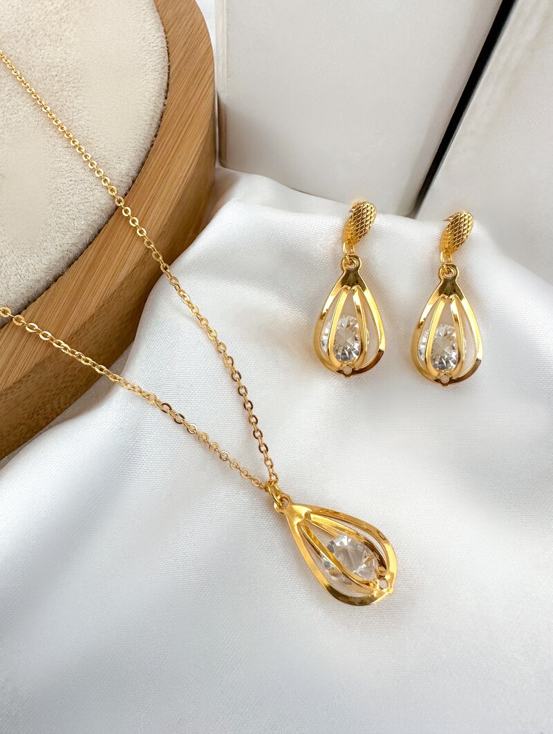 3. Conjunto Colar e Brinco Folheado a Ouro 18k e Prata Gota Vazada com Zircônia