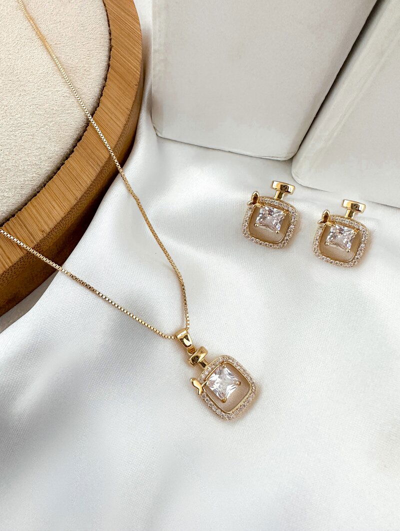 3. Conjunto Colar e Brinco Folheado a Ouro 18k e Prata Quadrado Cravejado com Zircônia