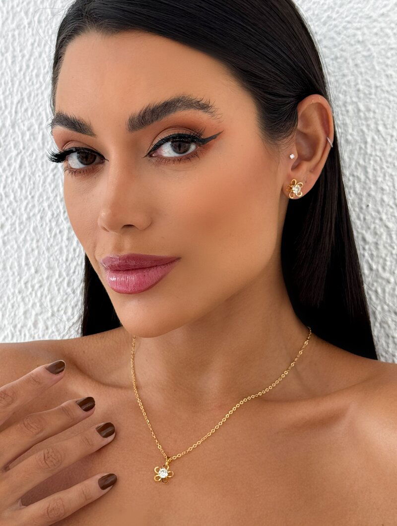3. Conjunto Colar e Brinco Folheado a Ouro 18k Flor Cinco Pétalas com Zircônia