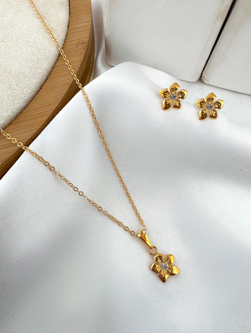 3. Conjunto Colar e Brinco Folheado a Ouro 18k Flor Minimalista