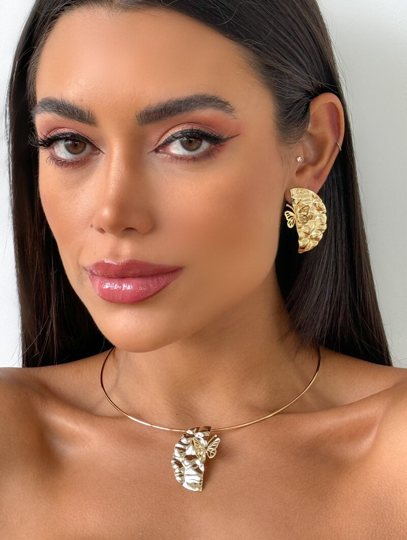 Conjunto Colar e Brinco Folheado a Ouro 18k Martelado com Borboleta