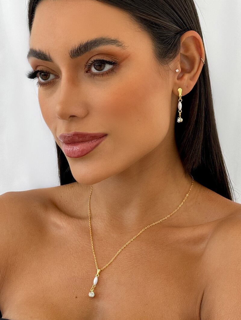 Conjunto Colar e Brinco Folheado a Ouro 18k Pérola com Ponto de Luz
