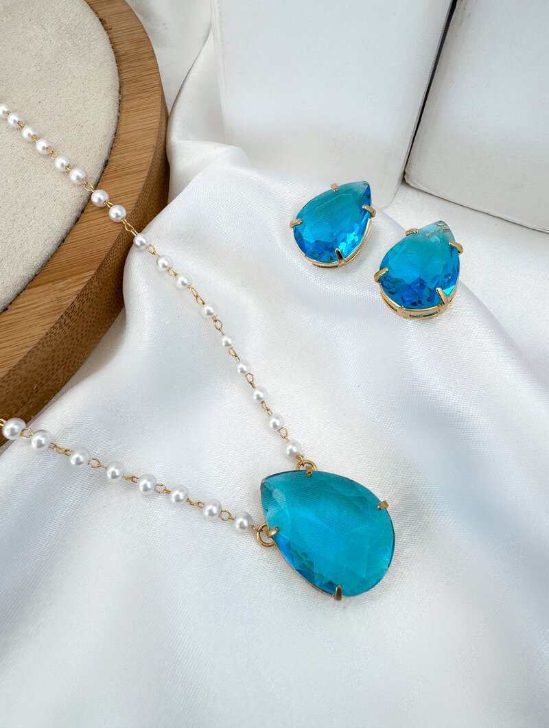 3. Conjunto Colar e Brinco Folheado a Ouro 18k Pérolas com Gota de Zircônia