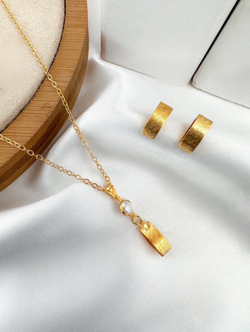 Conjunto Colar e Brinco Folheado a Ouro 18k Pingente Escovado com Pérola