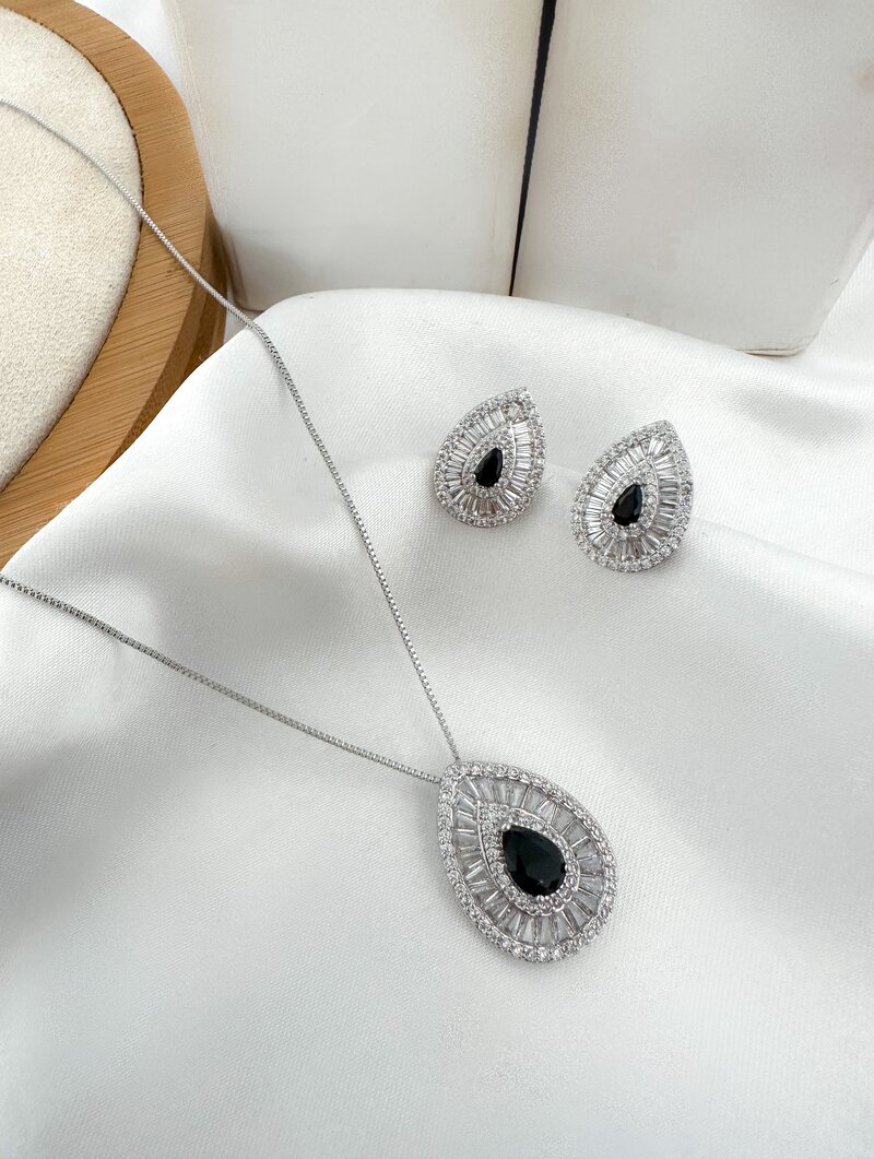 3. Conjunto Colar e Brinco Folheado a Prata Gota com Navetes e Zircônia Preta
