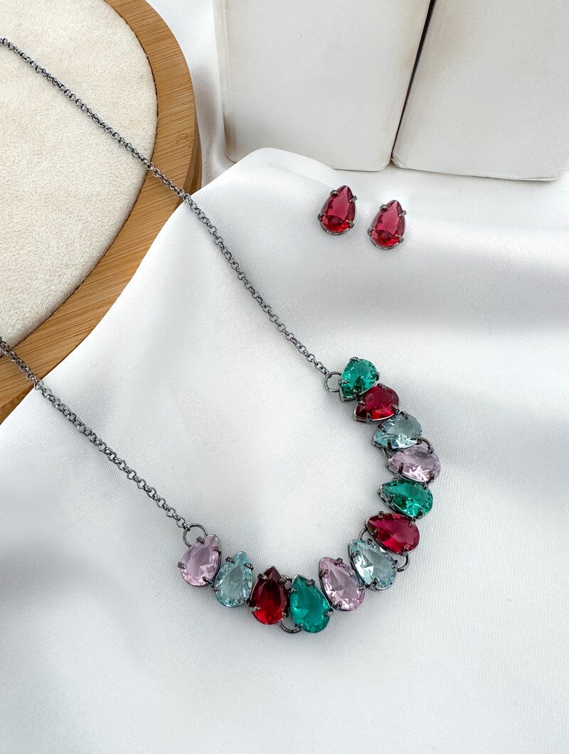 3. Conjunto Colar e Brinco Gotas de Zircônia Colorida